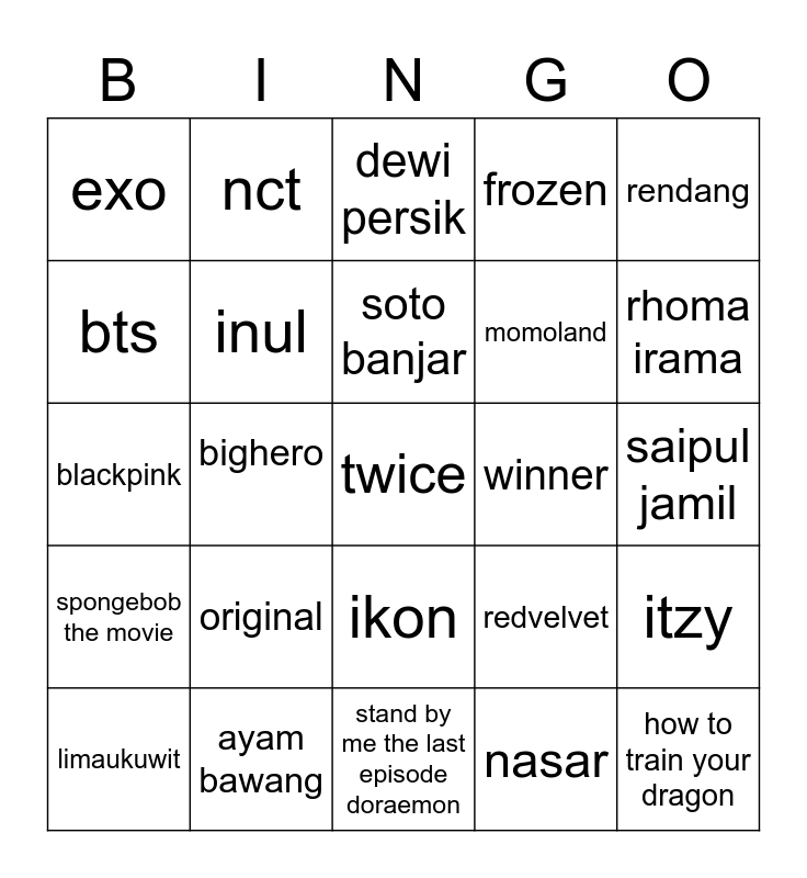 This bingo card has a free space and 24 words: original, ayam bawang, soto banjar, limaukuwit, rendang, exo, bts, nct, winner, ikon, momoland, blackpink, redvelvet, itzy, inul, nasar, saipul jamil, dewi persik, rhoma irama, bighero, how to train your dragon, spongebob the movie, frozen and stand by me the last episode doraemon.