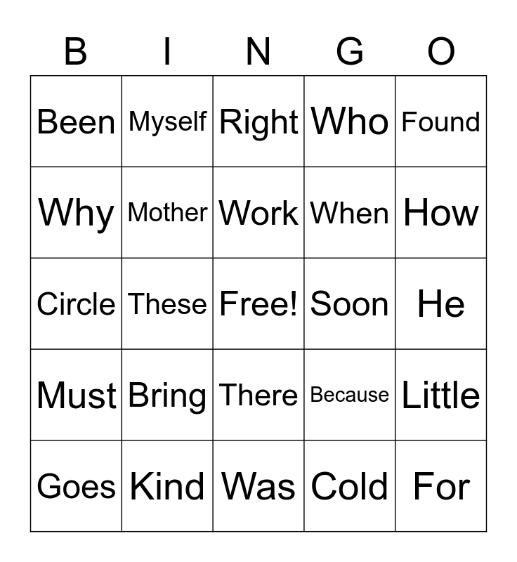 This bingo card has a free space and 34 words: Animal, Cold, Color, Does, Must, Mother, Found, Goes, Myself, Please, Work, Right, Says, Start, Soon, How, Kind, Circle, Bring, Because, There, Called, Been, He, Was, For, Who, What, When, Why, All, These, Little and Boy.