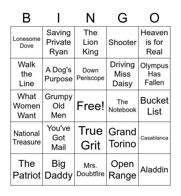 This bingo card has a free space and 34 words: Titanic, Open Range, The Last Mohican, Sound of Music, National Treasure, A Dog's Purpose, Heaven is for Real, The Patriot, Saving Private Ryan, U-571, Down Periscope, The Lion King, Princess Bride, Grease, The Notebook, Olympus Has Fallen, Big Daddy, What Women Want, You've Got Mail, Grand Torino, True Grit, Braveheart, Lonesome Dove, Bucket List, Mrs. Doubtfire, Aladdin, Shooter, Harry Potter, Driving Miss Daisy, Walk the Line, The Help, Grumpy Old Men, Casablanca and Singing in the Rain.