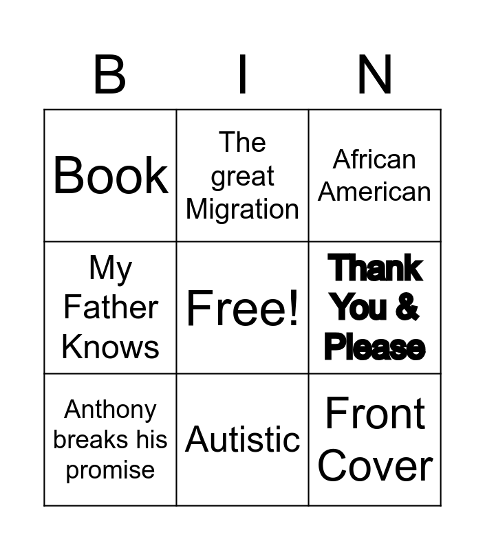 This bingo card has a free space and 8 words: Thank You & Please, African American, The great Migration, Anthony breaks his promise, Book, Front Cover, My Father Knows and Autistic.