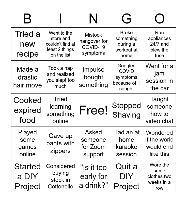 This bingo card has a free space and 44 words: "Pasta again?", Wore the same clothes two weeks in a row, Realized Spam was actually pretty good, Started a DIY Project, Talked to plants. they responded., Quit a DIY Project, Mistook hangover for COVID-19 symptoms, Reorganized the space rack, Ran appliances 24/7 and blew the fuse, Considered buying stock in Cottonelle, Broke something during a workout at home, Stopped Shaving, Asked someone for Zoom support, Gave up pants with zippers, Tried to mute the kids with a remote, "Is it too early for a drink?", Car got two weeks to the gallon, Cooked expired food, "Is it still Tuesday?", Went for a jam session in the car, Went to the store and couldn't find at least 2 things on the list, Wore a hat to a Zoom meeting, Ordered food 2 dinners in a row, Tried a new recipe, Called parents for the first time, Taught someone how to video chat, Binged watch a complete season in one sitting, Panicked when the internet didn't work, Had an at home karaoke session, Played some games online, Visited someone through the window, Wondered if the world would end like this, Cleaned the entire house just because you were bored, Discovered a new talent, Tried learning something online, Baked something, Have currently more than 20 rolls of toilet paper, "You're on mute", Impulse bought something, Made a drastic hair move, Googled COVID symptoms because of 1 cought, "When did I last shower", Took a nap and realized you slept too much and Hasn't lined up to get into a grocery store.