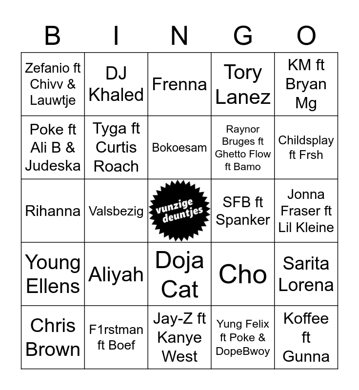 This bingo card has a free space and 75 words: Idaly, Tropical Danny, Frenna, Tabitha ft Ronnie Flex, Frans Bauer, SBMG ft Lil Kleine, Burna Boy, Megan Thee Stallion ft. Beyoncé, Josylvio ft Ashafar ft Moeman ft KA, Aya Nakamura, Def Rhymz, Beyoncé ft Jay-Z, Bokoesam, Poke ft Ali B & Judeska, Architrackz ft Bryan Mg, Valsbezig, Drake, Koffee ft Gunna, Fireboy DML, KM ft Bryan Mg, Usher ft Alicia Keys, Rihanna, Tyga ft Curtis Roach, DJ Khaled, Tory Lanez, Akwasi ft Bizzey, Nelly, Spice Girls, Hansie, PARTYNEXTDOOR ft Rihanna, Jayh, Eugy, Henkie T ft Jonna Fraser, Cho, Childsplay ft Frsh, Raynor Bruges ft Ghetto Flow ft Bamo, Delany, Bad Bunny, Jonna Fraser ft Lil Kleine, Yung Felix ft Poke & DopeBwoy, Broederliefde, Equalz, Konshens, Burna Boy, Chip Charlez, FMG ft LouiVos, Chris Brown, Zefanio ft Chivv & Lauwtje, Sevn Alias, Playboi Carti, Migos, Doja Cat, Latifah, DopeBwoy ft Chivv & 3robi, WizKid, Jorja Smith ft Burna Boy, Adje ft Jhorrmountain, Leafs, Snelle ft Frenna, J Balvin, Aliyah, Mayorkun, Angelo King ft Dutchie Fyz, Yung T & Bugsey, Caza ft Bokoesam ft Cartiez, SFB ft Spanker, Bilal Wahib ft Bizzey, T-Pain, Numidia ft Famke Louise, Sarita Lorena, Young Ellens, F1rstman ft Boef, Lil Kleine ft Maleek Berry ft Frenna, Jay-Z ft Kanye West and Ed Sheeran.