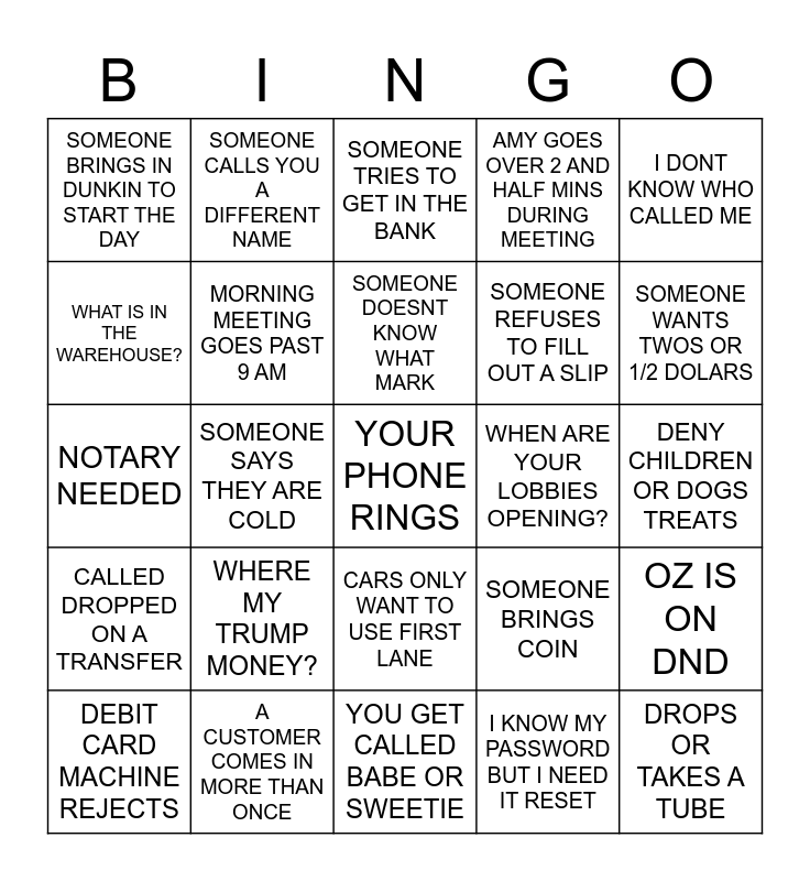 This bingo card has a free space and 24 words: WHERE MY TRUMP MONEY?, A CUSTOMER COMES IN MORE THAN ONCE, SOMEONE DOESNT KNOW WHAT MARK, DEBIT CARD MACHINE REJECTS, I DONT KNOW WHO CALLED ME, SOMEONE BRINGS IN DUNKIN TO START THE DAY, WHAT IS IN THE WAREHOUSE?, SOMEONE CALLS YOU A DIFFERENT NAME, WHEN ARE YOUR LOBBIES OPENING?, CARS ONLY WANT TO USE FIRST LANE, SOMEONE REFUSES TO FILL OUT A SLIP, NOTARY NEEDED, SOMEONE BRINGS COIN, OZ IS ON DND, MORNING MEETING GOES PAST 9 AM, I KNOW MY PASSWORD BUT I NEED IT RESET, DENY CHILDREN OR DOGS TREATS, SOMEONE TRIES TO GET IN THE BANK, SOMEONE WANTS TWOS OR 1/2 DOLARS, SOMEONE SAYS THEY ARE COLD, DROPS OR TAKES A TUBE, CALLED DROPPED ON A TRANSFER, AMY GOES OVER 2 AND HALF MINS DURING MEETING and YOU GET CALLED BABE OR SWEETIE.
