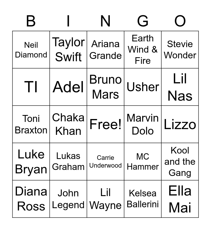 This bingo card has a free space and 29 words: Diana Ross, Michael Jackson, Chaka Khan, Whitney Houston, Neil Diamond, Ariana Grande, Adel, Lukas Graham, Marvin Dolo, John Legend, Lizzo, Ella Mai, Lil Wayne, Kelsea Ballerini, Lil Nas, Chris Brown, Carrie Underwood, Luke Bryan, Stevie Wonder, Toni Braxton, MC Hammer, Beyonce, Usher, TI, Earth Wind & Fire, Taylor Swift, Kool and the Gang, Bruno Mars and Rihanna.