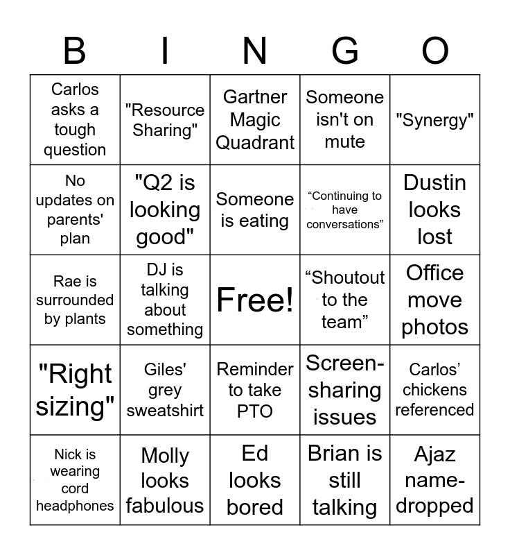 This bingo card has 6 images, a free space and 24 words: Giles' grey sweatshirt, Molly looks fabulous, Someone is eating, Nick is wearing cord headphones, "Synergy", Carlos asks a tough question, No updates on parents' plan, "Resource Sharing", “Shoutout to the team”, Reminder to take PTO, “Continuing to have conversations”, Rae is surrounded by plants, Screen-sharing issues, Carlos’ chickens referenced, "Q2 is looking good", Brian is still talking, Office move photos, Gartner Magic Quadrant, Dustin looks lost, DJ is talking about something, Ajaz name-dropped, "Right sizing", Someone isn't on mute and Ed looks bored.