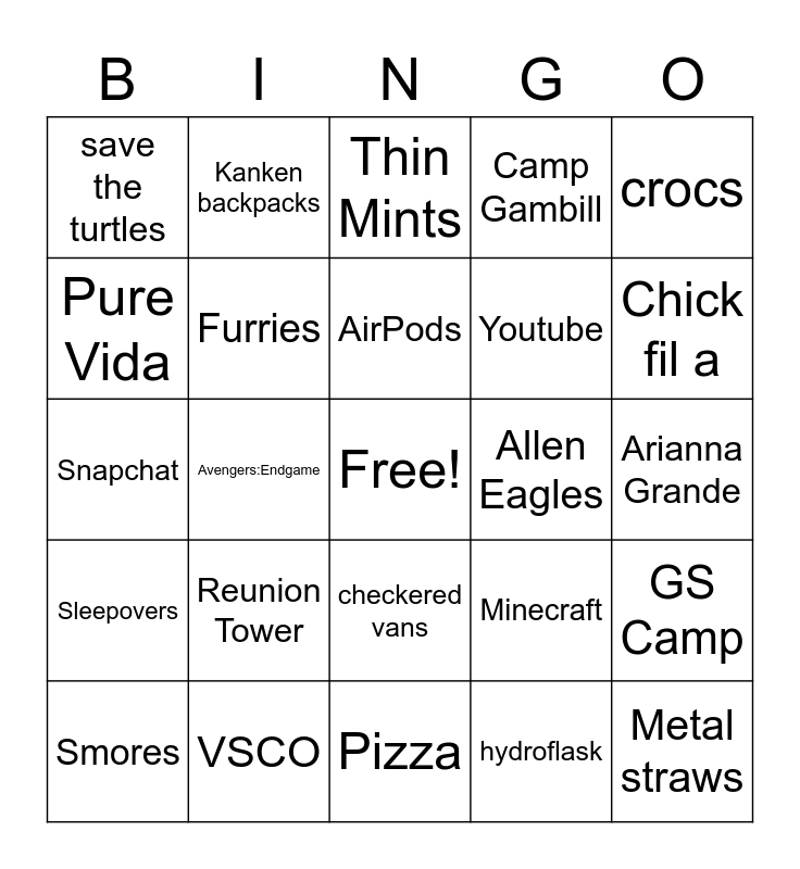 This bingo card has a free space and 26 words: checkered vans, hydroflask, AirPods, VSCO, crocs, save the turtles, Pure Vida, Kanken backpacks, Arianna Grande, Minecraft, Youtube, Snapchat, GS Camp, Smores, Avengers:Endgame, Bad Guy, Camp Gambill, Sleepovers, Thin Mints, Metal straws, Chick fil a, Pizza, Allen Eagles, Reunion Tower, Furries and Let's paint rocks.