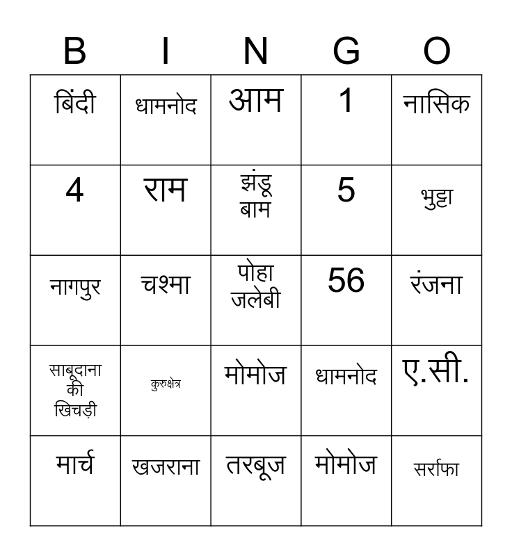 This bingo card has a free space and 29 words: मार्च, पानी पूरी, चश्मा, भiरत स्टूडियो, बिंदी, आम, राम, कुरुक्षेत्र, 56, खजराना, रंजना, सर्राफा, तरबूज, मोमोज, भुट्टा, रवा कुकीज़, मोमोज, साबूदाना की खिचड़ी, नासिक, नागपुर, धामनोद, इटारसी, 5, 4, 1, धामनोद, ए.सी., झंडू बाम and दाल ढोकली.
