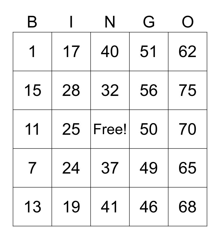 This bingo card has a free space and 24 words: 13, 24, 32, 46, 62, 1, 17, 40, 50, 70, 11, 28, 49, 65, 15, 19, 41, 51, 75, 7, 25, 37, 56 and 68.