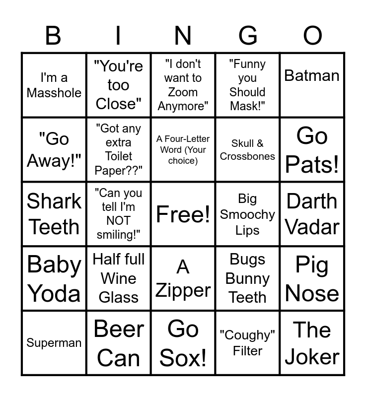 This bingo card has a free space and 24 words: Half full Wine Glass, Beer Can, A Four-Letter Word (Your choice), Superman, Batman, I'm a Masshole, "Go Away!", "You're too Close", Big Smoochy Lips, A Zipper, Skull & Crossbones, Shark Teeth, Bugs Bunny Teeth, Pig Nose, "Got any extra Toilet Paper??", "Coughy" Filter, Darth Vadar, "I don't want to Zoom Anymore", Go Pats!, "Can you tell I'm NOT smiling!", The Joker, Baby Yoda, "Funny you Should Mask!" and Go Sox!.