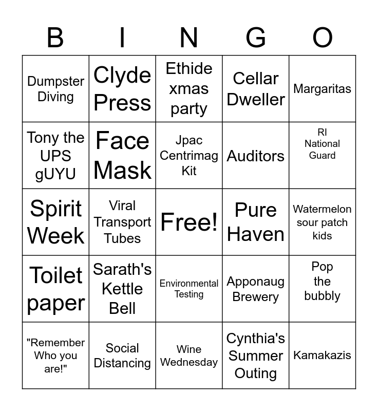 This bingo card has a free space and 24 words: Sarath's Kettle Bell, Social Distancing, Jpac Centrimag Kit, "Remember Who you are!", Margaritas, Dumpster Diving, Tony the UPS gUYU, Clyde Press, Pure Haven, Environmental Testing, Auditors, Spirit Week, Apponaug Brewery, Pop the bubbly, Face Mask, Cynthia's Summer Outing, Watermelon sour patch kids, Ethide xmas party, RI National Guard, Viral Transport Tubes, Kamakazis, Toilet paper, Cellar Dweller and Wine Wednesday.