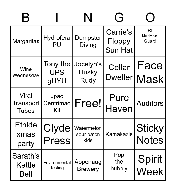 This bingo card has a free space and 29 words: Sarath's Kettle Bell, Social Distancing, Jpac Centrimag Kit, "Remember Who you are!", Margaritas, Dumpster Diving, Tony the UPS gUYU, Clyde Press, Pure Haven, Environmental Testing, Auditors, Spirit Week, Apponaug Brewery, Pop the bubbly, Face Mask, Cynthia's Summer Outing, Watermelon sour patch kids, Ethide xmas party, RI National Guard, Viral Transport Tubes, Kamakazis, Toilet paper, Cellar Dweller, Wine Wednesday, Carrie's Floppy Sun Hat, Hydrofera PU, Sticky Notes, Jocelyn's Husky Rudy and Kyle "oh Hello".