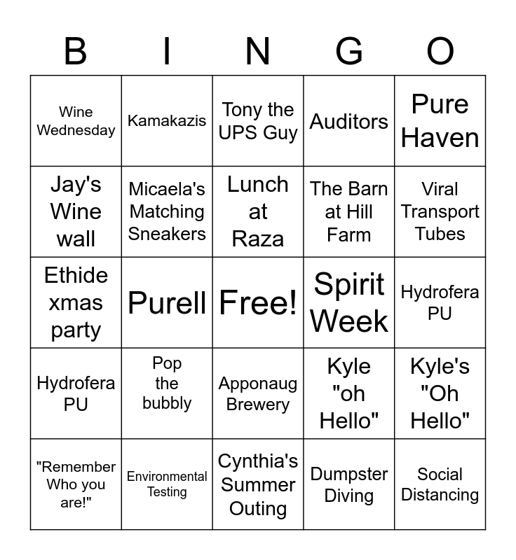 This bingo card has a free space and 44 words: Sarath's Kettle Bell, Social Distancing, Jpac Centrimag Kit, "Remember Who you are!", Margaritas, Dumpster Diving, Tony the UPS Guy, Clyde Press, Pure Haven, Environmental Testing, Auditors, Spirit Week, Apponaug Brewery, Pop the bubbly, Face Mask, Cynthia's Summer Outing, Watermelon sour patch kids, Ethide xmas party, RI National Guard, Viral Transport Tubes, Kamakazis, Toilet paper, Cellar Dweller, Wine Wednesday, Carrie's Floppy Sun Hat, Hydrofera PU, Sticky Notes, Jocelyn's Husky Rudy, Kyle "oh Hello", Hydrofera PU, Sticky Notes, Kyle's "Oh Hello", Team Lunch, Quickbooks, Purell, Bean Barn, Taco Tuesday, Corona with Lime, Lunch at Raza, Jay's Wine wall, The Barn at Hill Farm, Bean Barn, Micaela's Matching Sneakers and Dove Chocolates.