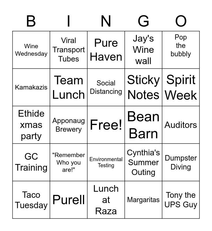 This bingo card has a free space and 42 words: Sarath's Kettle Bell, Social Distancing, Jpac Centrimag Kit, "Remember Who you are!", Margaritas, Dumpster Diving, Tony the UPS Guy, Clyde Press, Pure Haven, Environmental Testing, Auditors, Spirit Week, Apponaug Brewery, Pop the bubbly, Face Mask, Cynthia's Summer Outing, Watermelon sour patch kids, Ethide xmas party, RI National Guard, Viral Transport Tubes, Kamakazis, Toilet paper, Cellar Dweller, Wine Wednesday, Carrie's Floppy Sun Hat, Hydrofera PU, Sticky Notes, Jocelyn's Husky Rudy, Kyle "oh Hello", Dropped WIFI, Mullett Wig, GC Training, Team Lunch, Lunch at Raza, Corona with lime, Taco Tuesday, Purell, Bean Barn, Snack Time, Even more Viral Transport Medium, Jay's Wine wall and Quickbooks.
