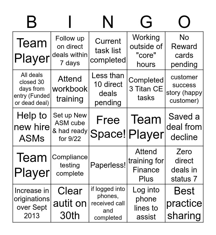 This bingo card has a free space and 24 words: Compliance testing complete, Clear autit on 30th, Less than 10 direct deals pending, Increase in originations over Sept 2013, No Reward cards pending, Team Player, All deals closed 30 days from entry (Funded or dead deal), Follow up on direct deals within 7 days, Team Player, Paperless!, Completed 3 Titan CE tasks, Help to new hire ASMs, Attend training for Finance Plus, Zero direct deals in status 7, Attend workbook training, Log into phone lines to assist, Saved a deal from decline, Current task list completed, customer success story (happy customer), Set up New ASM cube & had ready for 9/22, Best practice sharing, Team Player, Working outside of "core" hours and if logged into phones, received call and completed.