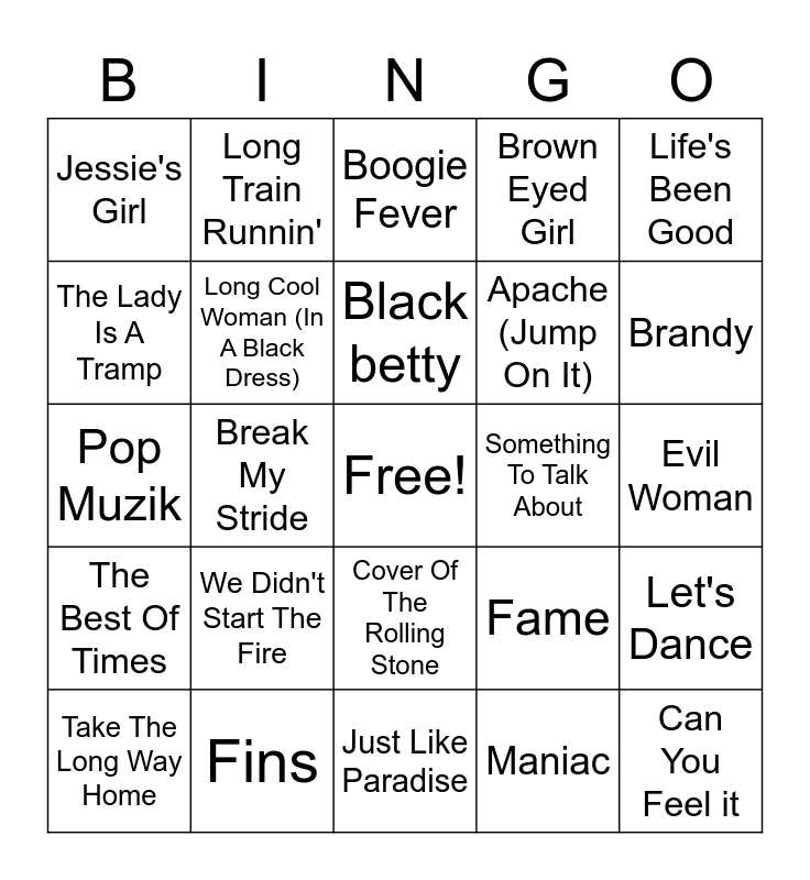 This bingo card has a free space and 50 words: My Girl (Gone Gone Gone), Can You Feel it, Heartbreaker, Just Like Paradise, We Didn't Start The Fire, Rock'N Me, Long Train Runnin', In America, The Lady Is A Tramp, I'm Gonna Be 500 Miles, Long Cool Woman (In A Black Dress), Brown Eyed Girl, Let's Dance, Fame, Dream On, Cold As Ice, Black betty, Something To Talk About, Should I Stay Or Should I Go, Life's Been Good, Break My Stride, Maniac, Jessie's Girl, Apache (Jump On It), Don't Stop Me Now, Ballroom Blitz, Brandy, Amie, Boogie Fever, Cover Of The Rolling Stone, Hold The Line, Rock &Roll Hoochie Koo, Margaritaville, Cheeseburger In Paradise, Fins, The ballad Of Curtis Loew, Jack & Diane, Glory Days, Midnight Rider, Evil Woman, Cars, Come Sail Away, Barracuda, This Is It, Take The Long Way Home, Pop Muzik, Crazy Little Thing Called Love, Money, The Best Of Times and Summer Breeze.