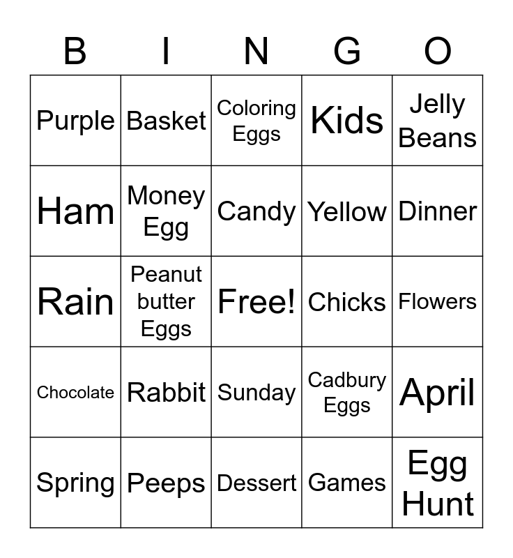 This bingo card has a free space and 24 words: Rabbit, Peeps, Candy, Spring, Jelly Beans, Purple, Ham, Basket, Chicks, Sunday, Yellow, Rain, Cadbury Eggs, April, Money Egg, Games, Flowers, Coloring Eggs, Dinner, Peanut butter Eggs, Egg Hunt, Chocolate, Kids and Dessert.