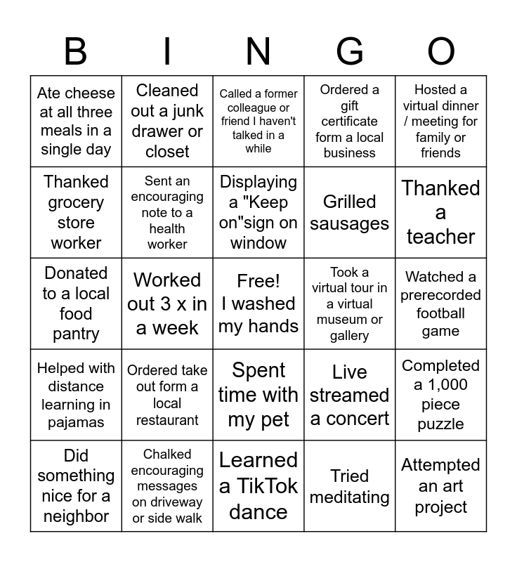 This bingo card has a free space and 24 words: Ordered take out form a local restaurant, Chalked encouraging messages on driveway or side walk, Displaying a "Keep on"sign on window, Did something nice for a neighbor, Hosted a virtual dinner / meeting for family or friends, Ate cheese at all three meals in a single day, Thanked grocery store worker, Cleaned out a junk drawer or closet, Took a virtual tour in a virtual museum or gallery, Spent time with my pet, Grilled sausages, Donated to a local food pantry, Live streamed a concert, Completed a 1,000 piece puzzle, Sent an encouraging note to a health worker, Tried meditating, Watched a prerecorded football game, Called a former colleague or friend I haven't talked in a while, Thanked a teacher, Worked out 3 x in a week, Attempted an art project, Helped with distance learning in pajamas, Ordered a gift certificate form a local business and Learned a TikTok dance.