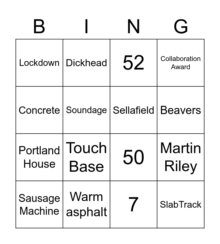 This bingo card has 49 words: Free!, Sausage Machine, Angela Mannion, Sicknote Ali, Secret Squirrel, Team Admin, Dickhead, Tender clarifications, Soundage, Rottweiler, Sellafield, Collaboration Award, Steel Fibres, 4 kids, 2 husbands and an Excel spreadsheet, Nick Loves Tim Jordan, Not to Worry, Beavers, Warm asphalt, HS2, Concrete, Martin Riley, Covid-19, Lockdown, Portland House, Lobby Gobblers, Touch Base, Tarmac, Engagement, It’ll be reet, SlabTrack, Lynchpin, Furloughed, Bingo, Dance off, 1, 2, 3, 5, 7, 17, 19, 21, 22, 41, 50, 52, 65, 69 and 75.