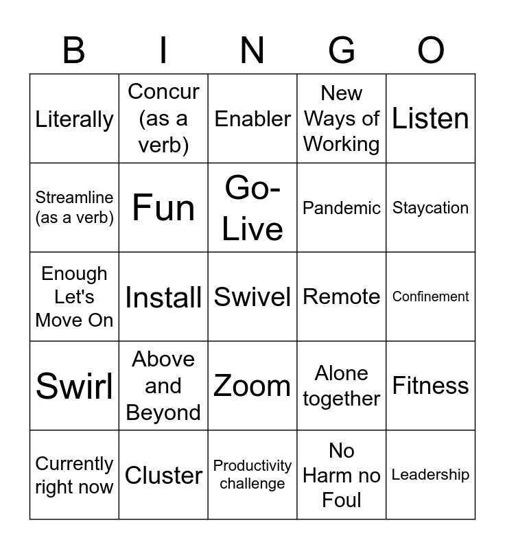 This bingo card has 25 words: Above and Beyond, Productivity challenge, Go-Live, Currently right now, Listen, Literally, Streamline (as a verb), Concur (as a verb), Remote, Zoom, Pandemic, Enough Let's Move On, Alone together, Fitness, Fun, Leadership, Confinement, Enabler, Staycation, Install, Swivel, Cluster, Swirl, New Ways of Working and No Harm no Foul.