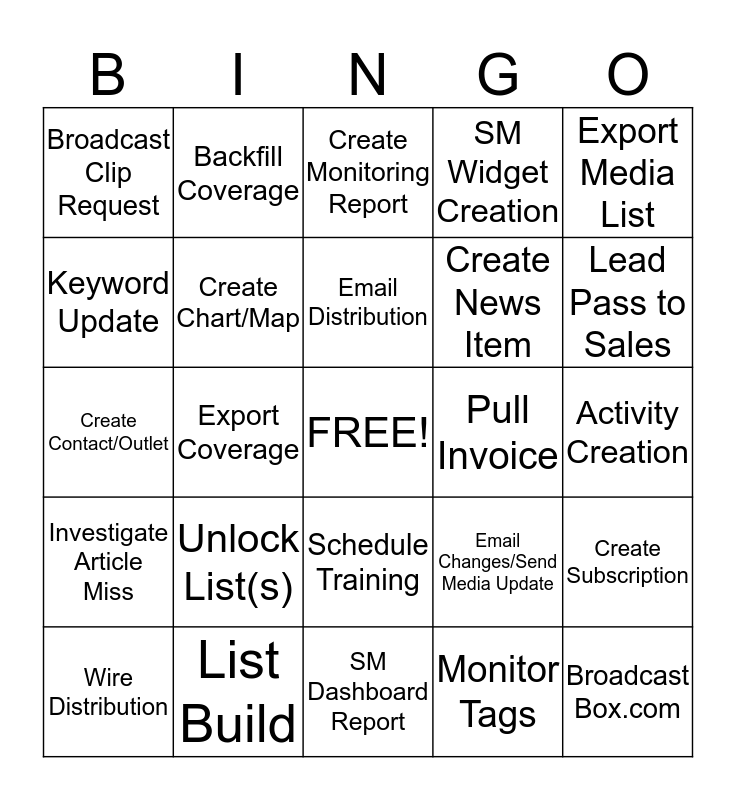 This bingo card has a free space and 24 words: Unlock List(s), List Build, Email Distribution, Wire Distribution, Export Media List, Broadcast Clip Request, Keyword Update, Backfill Coverage, Pull Invoice, Schedule Training, Create News Item, Create Contact/Outlet, Email Changes/Send Media Update, Create Subscription, Create Chart/Map, Monitor Tags, Activity Creation, Create Monitoring Report, Lead Pass to Sales, Export Coverage, Broadcast Box.com, Investigate Article Miss, SM Widget Creation and SM Dashboard Report.