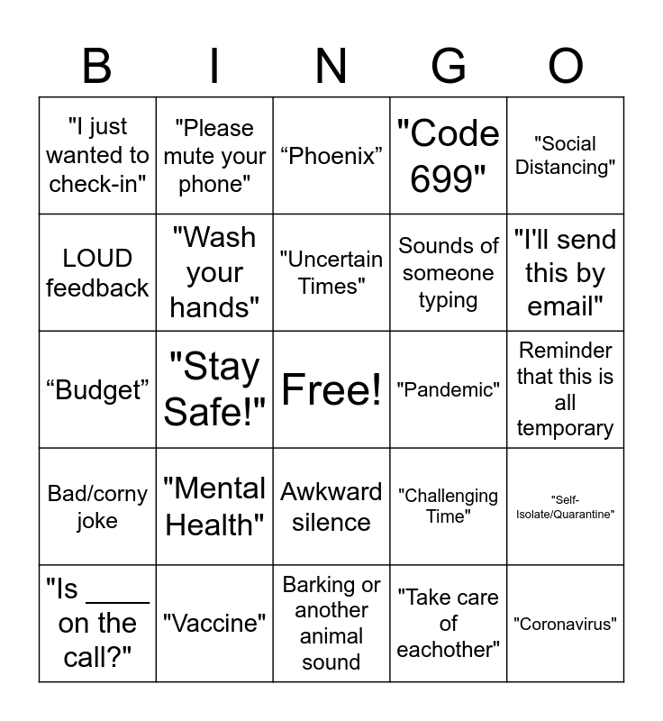 This bingo card has a free space and 49 words: "Covid-19", "Coronavirus", "Great Job!", Barking or another animal sound, "Mental Health", Kids yelling/screaming/crying, "Please mute your phone", "Please Unmute your phone", LOUD feedback, Coughing, "Wash your hands", "Code 699", "Self-Isolate/Quarantine", "Challenging Time", Any mention of Zoom or Skype, Something along the lines of "We are here to Help", "Uncertain Times", "Pandemic", "Flatten the curve", "Social Distancing", "Stay Safe!", "Take care of eachother", "I just wanted to check-in", Sounds of someone typing, "Hello? Hello?!", "I'll send this by email", "Is ____ on the call?", Cutting in and out, Awkward silence, Bad/corny joke, "How is everyone???", Someone has connection issues, "Can you send that to everyone?", More than 2 acronyms in a sentence, "Vaccine", Any weather talk, Meeting starts late, Construction Noises, Reminder that this is all temporary, "Ergonomic", Any mention of our Key work programs, "unprecedented situation", “Schoolwork / Homeschooling”, Visa Offices/overseas, “Budget”, “Phoenix”, Any mention of exercise (Yoga, walking, etc.), Any mention of temporary workers and SLIDO.