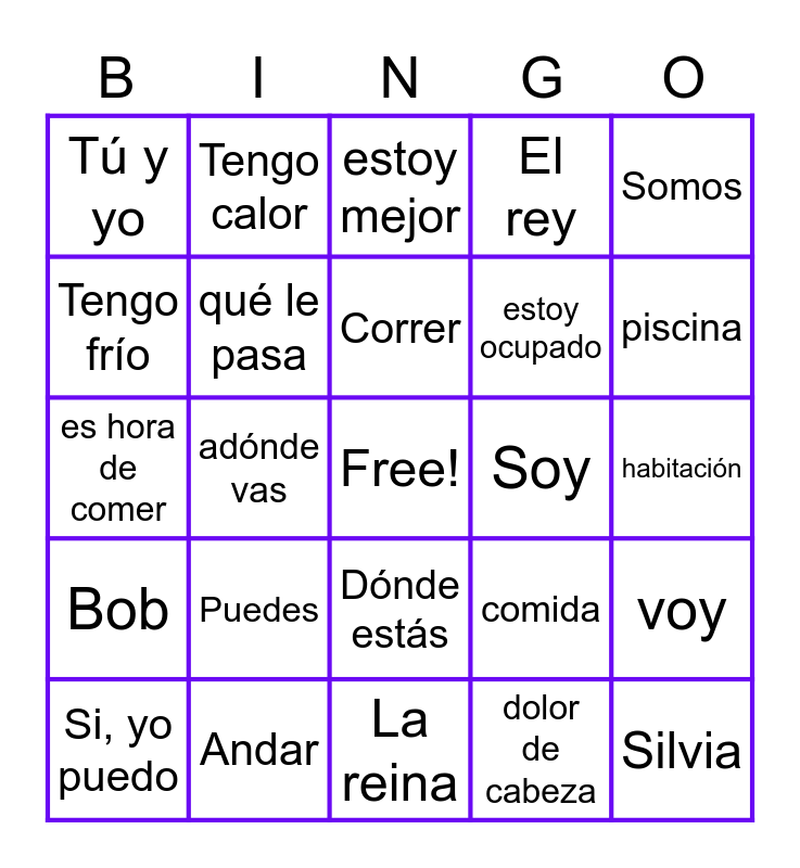 This bingo card has a free space and 24 words: Puedes, Andar, Correr, Si, yo puedo, Somos, Tú y yo, Tengo frío, Tengo calor, Soy, Dónde estás, estoy ocupado, es hora de comer, comida, voy, qué le pasa, dolor de cabeza, habitación, estoy mejor, piscina, adónde vas, Silvia, Bob, El rey and La reina.