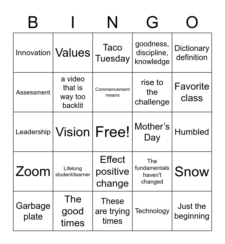 This bingo card has a free space and 59 words: Proud of you, The good times, Unprecedented, Zoom, Technology, COVID (or coronavirus), a video that is way too backlit, an embarrassing quarantine story, rise to the challenge, pandemic, goodness, discipline, knowledge, Fisher Family, Assessment, Inclusiveness, Student-centered, Innovation, Just the beginning, Dictionary definition, Inspirational quote, Commencement means, Mother’s Day, Taco Tuesday, Garbage plate, Snow, Weather, Freshman year, Liberal arts, Career, Favorite class, Roll up your sleeves, Community, Class of 2020, Basilian Fathers, Took/take a leap, Values, Creed, Mission statement, Vision, Journey, Leadership, New chapter, Lifelong student/learner, Humbled, Ups and downs, Sacrifice, Achievement, Change the world, Alumni donation, Effect positive change, These are trying times, We live in strange times, Can you all hear me?, I think you're on mute, Radio silence for more than 10 seconds, Gremlins, The fundamentals haven't changed, Don't be afraid, You'll/We'll get through this and The future's still bright.