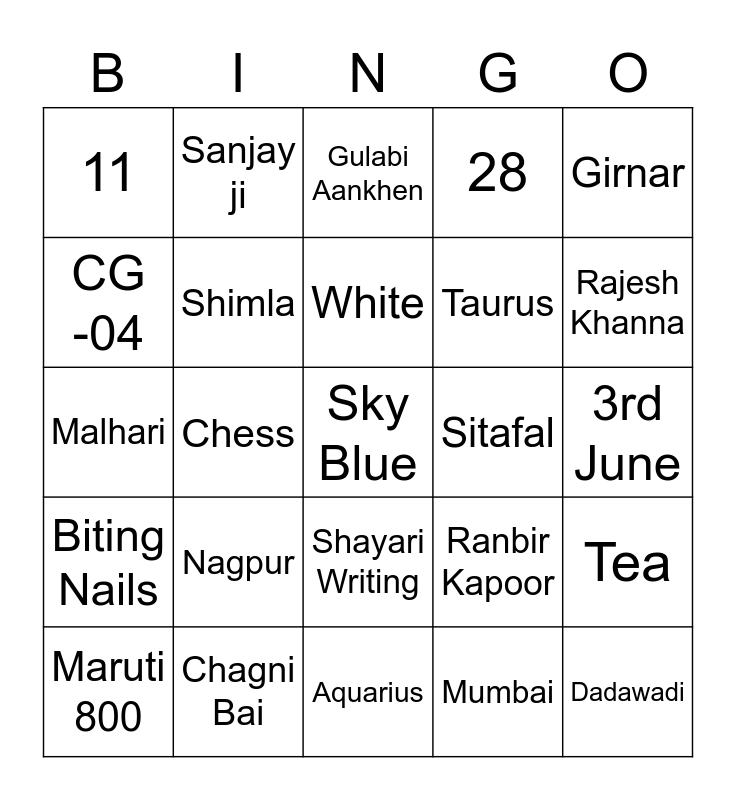 This bingo card has a free space and 49 words: 5th May, Dadawadi, Malegoan, Aquarius, Nagpur, Gupchup, Sanjay ji, Dhule, CG -04, Mango, Shimla, 28, Tea, Ranbir Kapoor, Dhadkan, Phool tumhe bheja hain, White, Sitafal, 40, Girnar, Chess, Mumbai, 11, Taurus, Moustache, Rajesh Khanna, Maruti 800, Collecting diaries, Shayari Writing, Biting Nails, Wada Pav, Kedia, Nirmala Devi, Bhala, Chagni Bai, Ghanshyam, Cleanliness Freak, 1st December, 3rd June, Mughal E Azam, Tujh main rab dikhta hain, Mera Naam Joker, Krantiveer, Pani Da rang, Malhari, Gulabi Aankhen, Main Shayar toh nahi, Jeena isika naam hain and Gadar.
