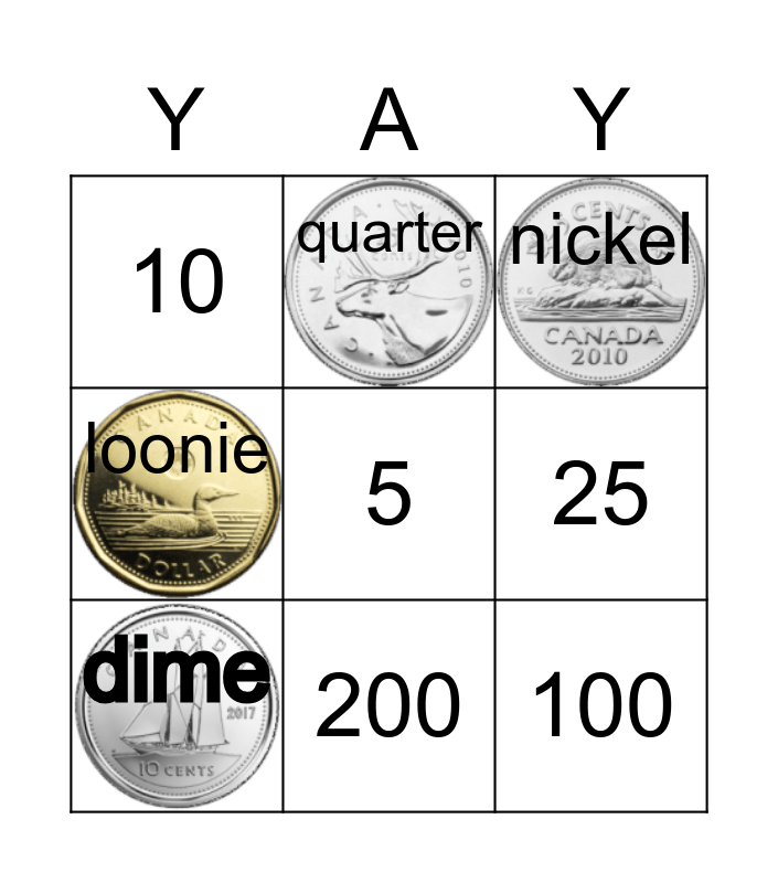 This bingo card has 4 images and 9 words: dime, nickel, quarter, loonie, 10, 25, 5, 100 and 200.
