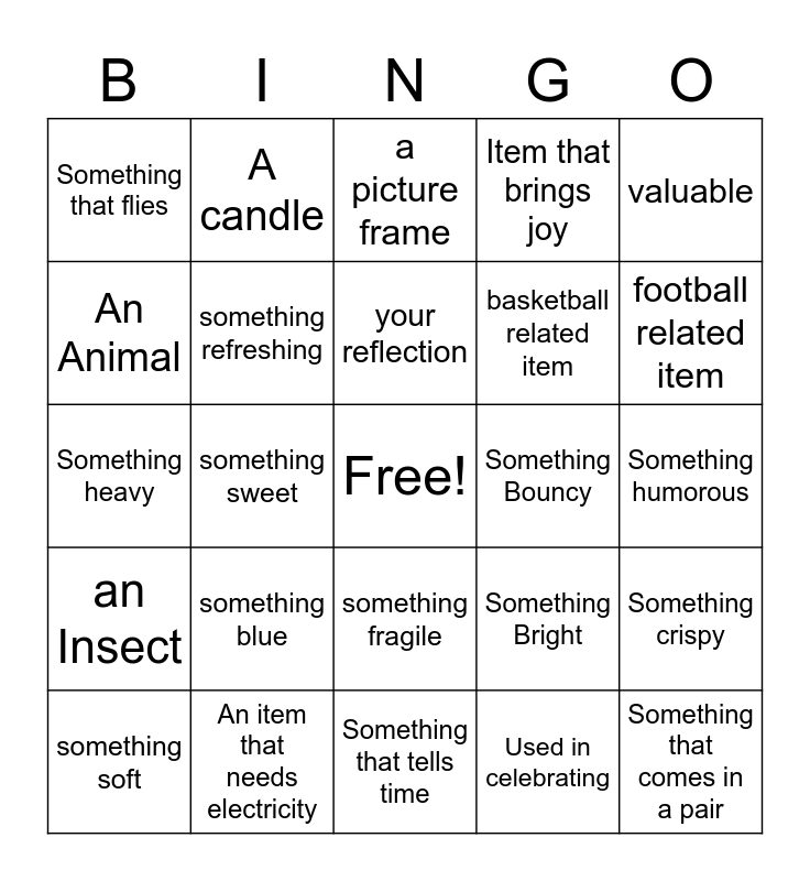 This bingo card has a free space and 24 words: something blue, An item that needs electricity, your reflection, something soft, valuable, Something that flies, An Animal, A candle, Something Bouncy, something fragile, basketball related item, Something heavy, Something Bright, Something crispy, something refreshing, Used in celebrating, Something humorous, a picture frame, football related item, something sweet, Something that comes in a pair, an Insect, Item that brings joy and Something that tells time.