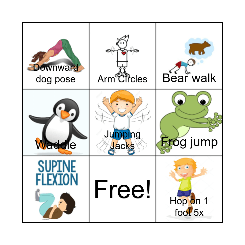 This bingo card has 8 images, a free space and 8 words: Bear walk, Arm Circles, Waddle, Downward dog pose, Frog jump, Hop on 1 foot 5x, one foot balance and Free!.