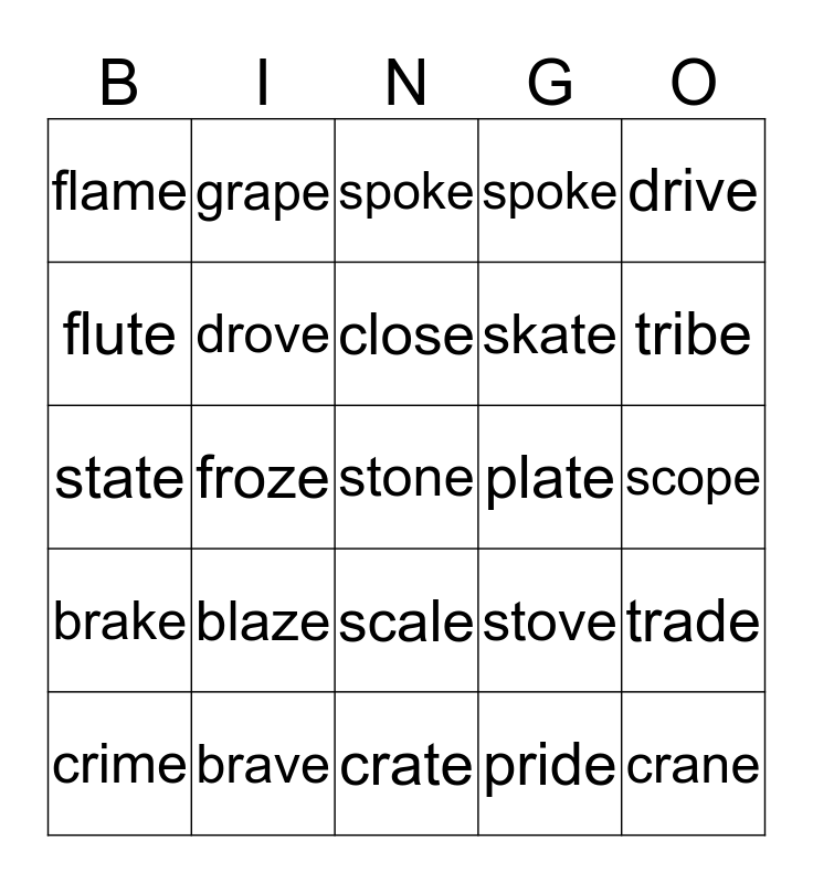 This bingo card has a free space and 24 words: blaze, brave, close, crime, drive, flame, flute, grape, plate, scale, skate, state, stove, trade, drove, pride, scope, spoke, tribe, froze, crane, brake, spoke and crate.