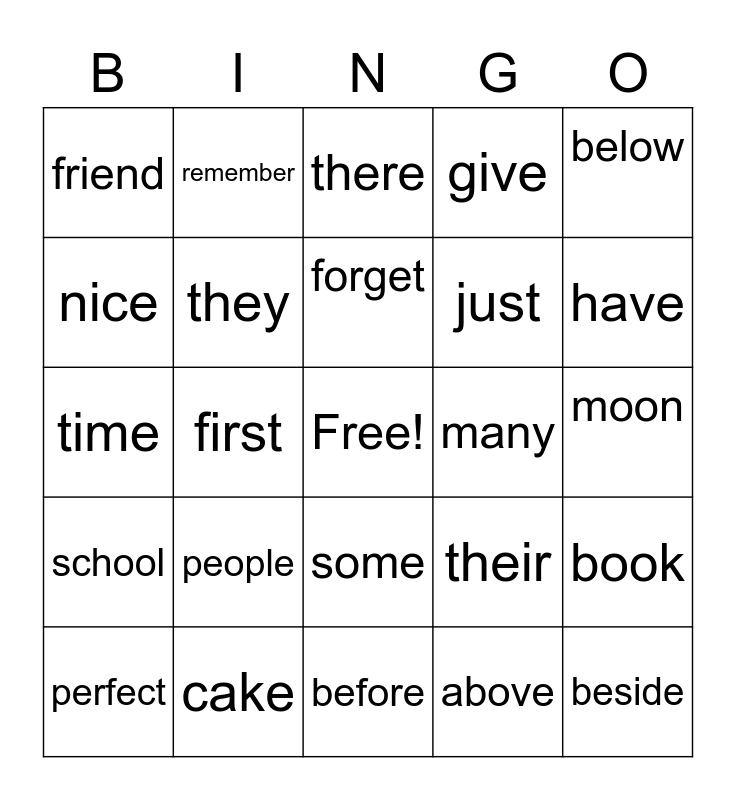 This bingo card has a free space and 24 words: perfect, people, forget, above, below, friend, remember, there, many, moon, time, they, their, book, nice, cake, before, give, have, school, first, some, just and beside.
