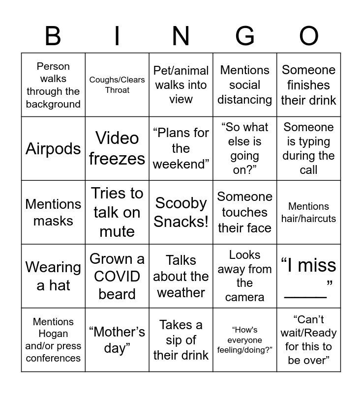 This bingo card has a free space and 31 words: Takes a sip of their drink, Gets up from the computer, Tries to talk on mute, Two people talk at the same time, Person walks through the background, Pet/animal walks into view, Video freezes, Looks away from the camera, Someone touches their face, “How's everyone feeling/doing?”, Mentions hair/haircuts, “Can’t wait/Ready for this to be over”, Awkward silence, Random noises in the background, Someone is typing during the call, Hear an email/calendar notification, “I miss ____”, Grown a COVID beard, Wearing a hat, Talks about the weather, Someone finishes their drink, Mentions COVID, Mentions Hogan and/or press conferences, Coughs/Clears Throat, “So what else is going on?”, Airpods, Mentions social distancing, Mentions masks, “Mother’s day”, “Plans for the weekend” and Mentions projects they’ve done.