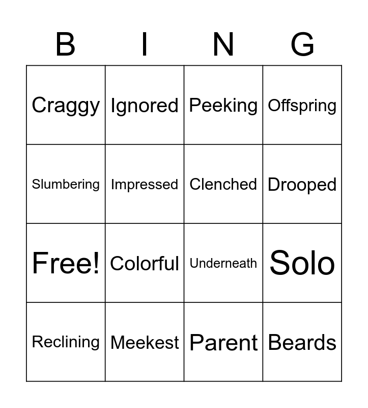 This bingo card has 20 words: Solo, Thrill, Peeking, Sneaking, Reclining, Slumbering, Meekest, Craggy, Free!, Ignored, Colorful, Underneath, Impressed, Beards, Clenched, Trembling, Drooped, Offspring, Parent and Climbed.