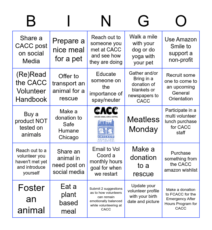 This bingo card has a free space and 24 words: Share an animal in need post on social media, Eat a plant based meal, Educate someone on the importance of spay/neuter, Foster an animal, Use Amazon Smile to support a non-profit, Share a CACC post on social Media, (Re)Read the CACC Volunteer Handbook, Prepare a nice meal for a pet, Meatless Monday, Email to Vol Coord a monthly hours goal for when we restart, Gather and/or Bring in a donation of blankets or newspapers to CACC, Buy a product NOT tested on animals, Make a donation to a rescue, Purchase something from the CACC amazon wishlist, Offer to transport an animal for a rescue, Update your volunteer profile with your birth date and picture, Participate in a multi volunteer lunch purchase for CACC staff, Reach out to someone you met at CACC and see how they are doing, Recruit some one to come to an upcoming General Orientation, Make a donation to Safe Humane Chicago, Make a donation to FCACC for the Emergency After Hours Program for CACC, Reach out to a volunteer you haven't met yet and introduce yourself, Walk a mile with your dog or do yoga with your pet and Submit 2 suggestions as to how volunteers can remain emotionally balanced while volunteering at CACC.