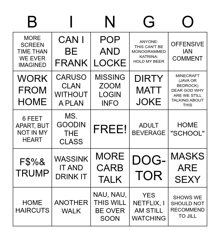 This bingo card has a free space and 24 words: WASSINK IT AND DRINK IT, ANOTHER WALK, MISSING ZOOM LOGIN INFO, HOME HAIRCUTS, OFFENSIVE IAN COMMENT, MORE SCREEN TIME THAN WE EVER IMAGINED, WORK FROM HOME, CAN I BE FRANK, ADULT BEVERAGE, MORE CARB TALK, DIRTY MATT JOKE, 6 FEET APART, BUT NOT IN MY HEART, DOG-TOR, MASKS ARE SEXY, CARUSO CLAN WITHOUT A PLAN, YES NETFLIX, I AM STILL WATCHING, HOME "SCHOOL", POP AND LOCKE, MINECRAFT (JAVA OR BEDROCK) DEAR GOD WHY ARE WE STILL TALKING ABOUT THIS, MS. GOODIN THE CLASS, SHOWS WE SHOULD NOT RECOMMEND TO JILL, F$%& TRUMP, ANYONE: THIS CAN'T BE MONOGRAMMED KATRINA: HOLD MY BEER and NAU, NAU, THIS WILL BE OVER SOON.