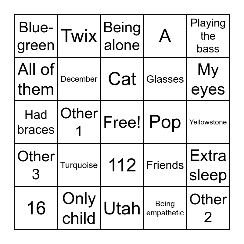 This bingo card has a free space and 24 words: Turquoise, Only child, Cat, 16, Playing the bass, Blue-green, All of them, Twix, Pop, 112, Glasses, Had braces, Friends, Extra sleep, December, Being empathetic, Yellowstone, Being alone, My eyes, Other 1, Other 2, Other 3, A and Utah.