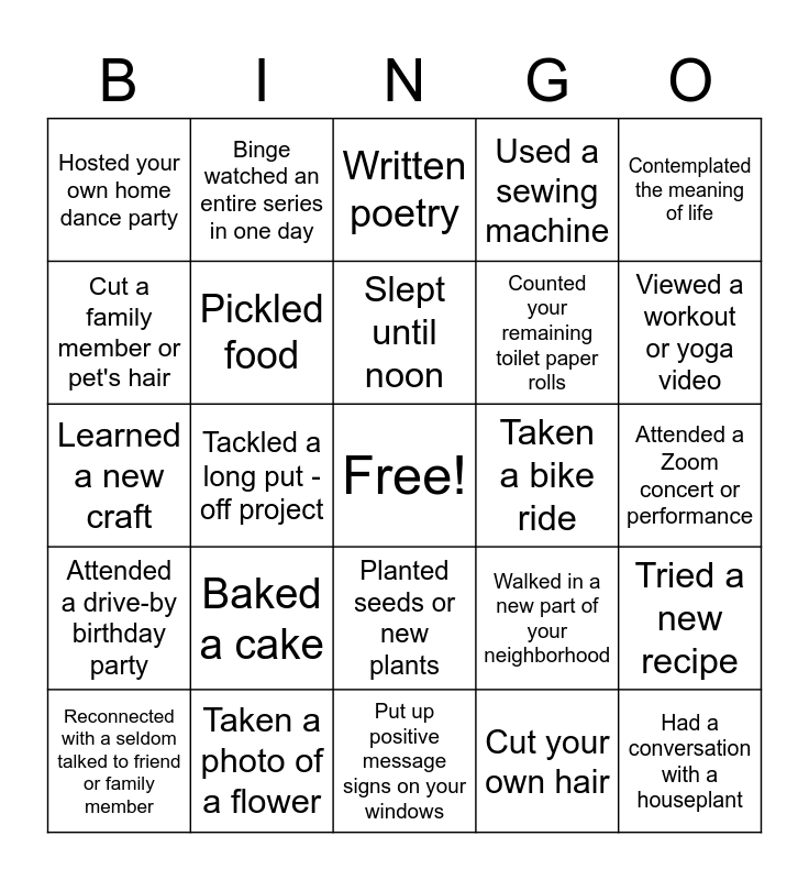 This bingo card has a free space and 24 words: Baked a cake, Taken a photo of a flower, Slept until noon, Reconnected with a seldom talked to friend or family member, Contemplated the meaning of life, Hosted your own home dance party, Cut a family member or pet's hair, Binge watched an entire series in one day, Taken a bike ride, Planted seeds or new plants, Counted your remaining toilet paper rolls, Learned a new craft, Walked in a new part of your neighborhood, Tried a new recipe, Pickled food, Cut your own hair, Attended a Zoom concert or performance, Written poetry, Viewed a workout or yoga video, Tackled a long put -off project, Had a conversation with a houseplant, Attended a drive-by birthday party, Used a sewing machine and Put up positive message signs on your windows.