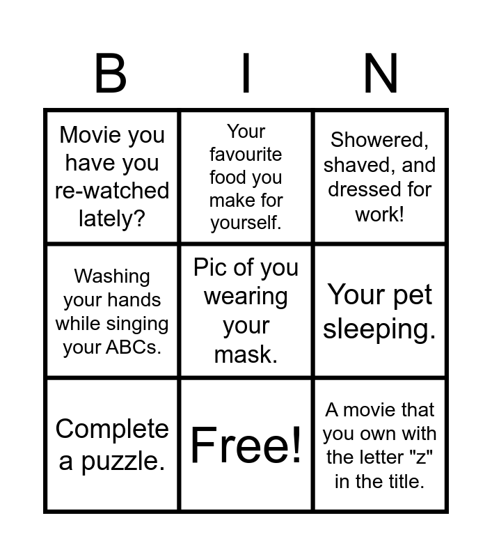 This bingo card has a free space and 8 words: Your pet sleeping., Showered, shaved, and dressed for work!, Your favourite food you make for yourself., Complete a puzzle., Movie you have you re-watched lately?, A movie that you own with the letter "z" in the title., Washing your hands while singing your ABCs. and Free!.