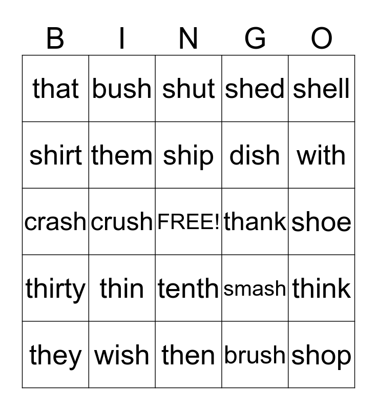 This bingo card has a free space and 38 words: fish, wash, bath, them, think, thin, ship, sheep, shell, dish, crush, shed, shop, shoe, shirt, thirty, thirsty, shut, math, thank, that, wish, with, they, this, then, thick, path, third, fourth, sixth, tenth, brush, bush, mash, smash, crash and bash.