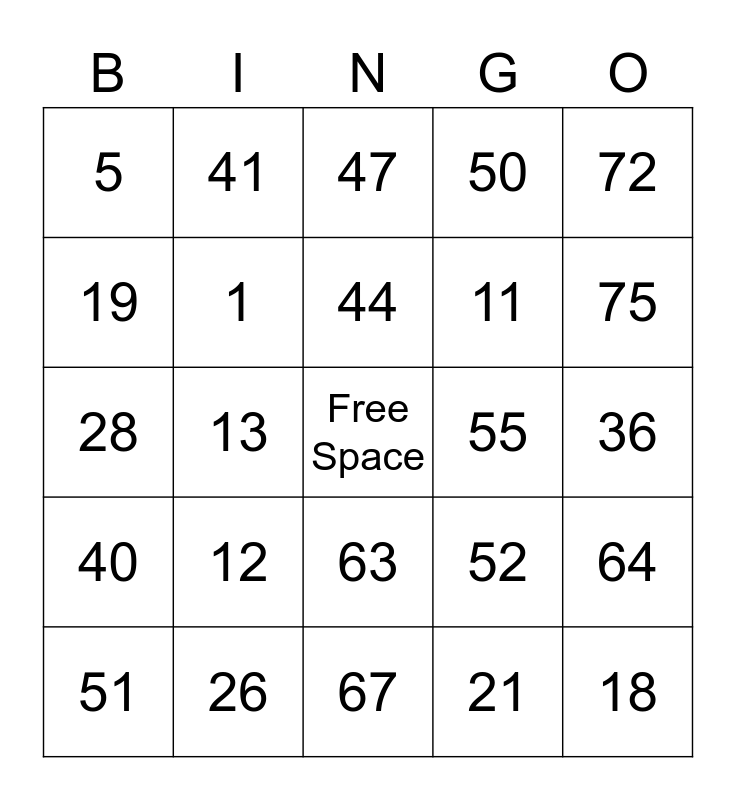 This bingo card has a free space and 24 words: 12, 26, 44, 51, 72, 5, 19, 41, 55, 63, 11, 28, 52, 64, 1, 21, 36, 47, 75, 13, 18, 40, 50 and 67.