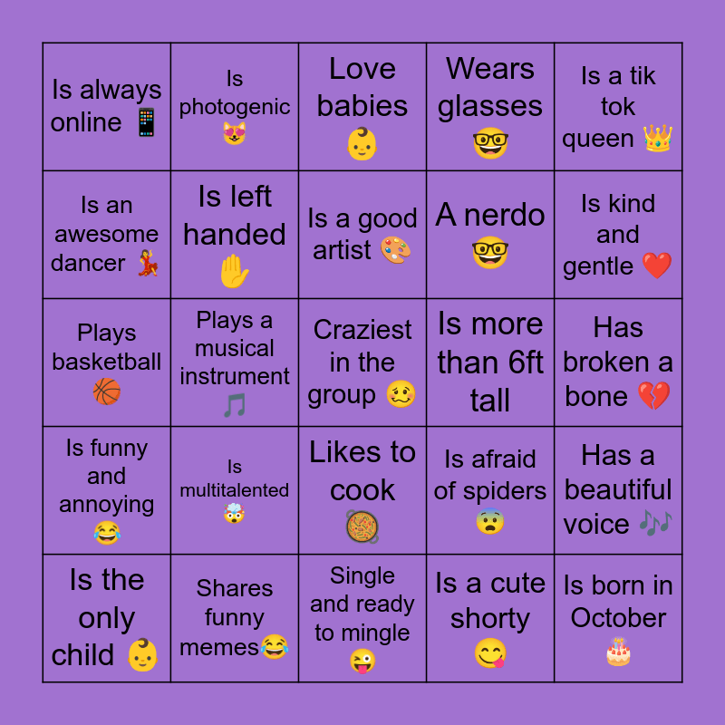 This bingo card has a free space and 24 words: Is multitalented π€―, Shares funny memesπ, Is a good artist π¨, Is the only child πΆ, Is a tik tok queen π, Is always online π±, Is an awesome dancer π, Is photogenic π», Is more than 6ft tall, Likes to cook π₯, A nerdo π€, Plays basketball π, Is afraid of spiders π¨, Has a beautiful voice πΆ, Is left handedβ, Is a cute shorty π, Has broken a bone π, Love babiesπΆ, Is kind and gentle β€οΈ, Plays a musical instrument π΅, Is born in October π, Is funny and annoying π, Wears glasses π€ and Single and ready to mingle π.