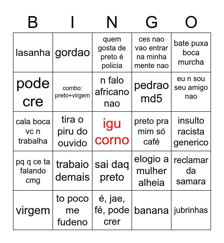 This bingo card has a free space and 24 words: virgem, trabaio demais, n falo africano nao, banana, bate puxa boca murcha, lasanha, gordao, quem gosta de preto é policia, preto pra mim só café, insulto racista generico, cala boca vc n trabalha, combo: preto+virgem, elogio a mulher alheia, reclamar da samara, pode cre, to poco me fudeno, é, jae, fé, pode crer, ces nao vao entrar na minha mente nao, eu n sou seu amigo nao, pq q ce ta falando cmg, tira o piru do ouvido, sai daq preto, pedrao md5 and jubrinhas.
