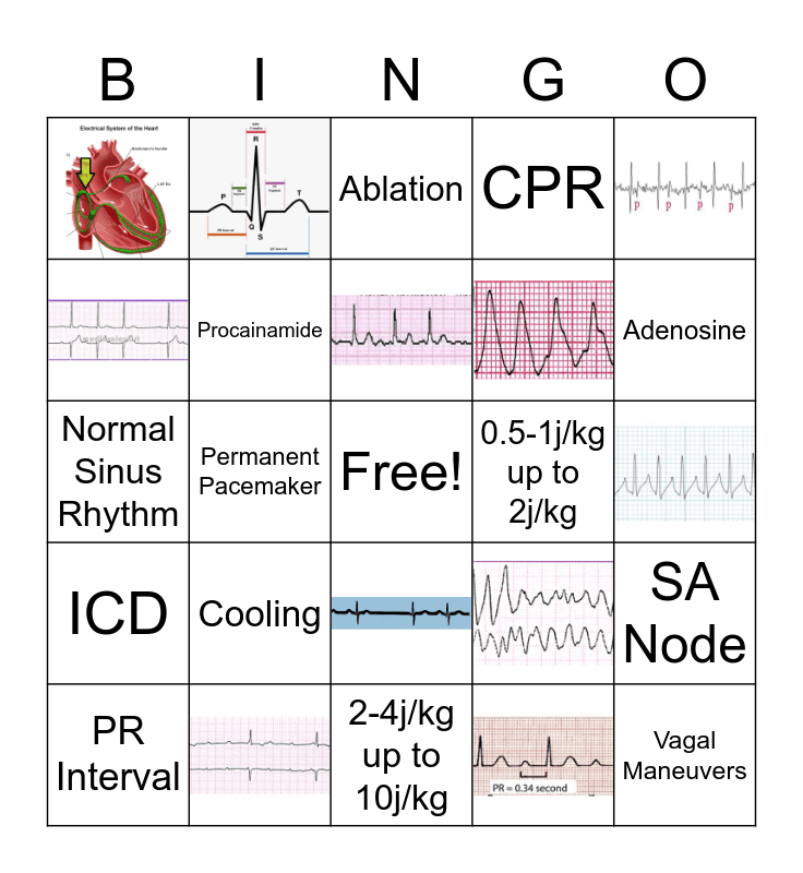 This bingo card has 11 images, a free space and 15 words: Normal Sinus Rhythm, SA Node, PR Interval, Permanent Pacemaker, Cardioversion, CPR, ICD, Ablation, Vagal Maneuvers, Adenosine, 2-4j/kg up to 10j/kg, 0.5-1j/kg up to 2j/kg, Cooling, Procainamide and Amiodarone.