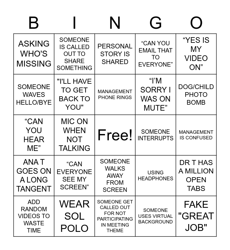 This bingo card has a free space and 30 words: WEAR SOL POLO, ANA T FAKE LAUGHS, MIC ON WHEN NOT TALKING, NO ONE ANSWERS A QUESTION, ASKING WHO'S MISSING, PERSONAL STORY IS SHARED, "I'LL HAVE TO GET BACK TO YOU", SOMEONE WALKS AWAY FROM SCREEN, SOMEONE INTERRUPTS, SOMEONE GET CALLED OUT FOR NOT PARTICIPATING IN MEETING THEME, MANAGEMENT IS CONFUSED, FAKE "GREAT JOB", SOMEONE USES VIRTUAL BACKGROUND, SOMEONE EATING ON SCREEN, DOG/CHILD PHOTO BOMB, JOHANNA SAYS SOMETHING NEEDS TO BE EXPLAINED FURTHER, USING HEADPHONES, ANA T GOES ON A LONG TANGENT, “CAN EVERYONE SEE MY SCREEN”, “YES IS MY VIDEO ON”, “CAN YOU HEAR ME”, ONE OF THE SUPERVISORS IS LATE, SOMEONE IS CALLED OUT TO SHARE SOMETHING, “I’M SORRY I WAS ON MUTE”, SOMEONE WAVES HELLO/BYE, “CAN YOU EMAIL THAT TO EVERYONE”, DR T HAS A MILLION OPEN TABS, ADD RANDOM VIDEOS TO WASTE TIME, MANAGEMENT PHONE RINGS and SOMEONE COMMENTS ON THE CHAT.