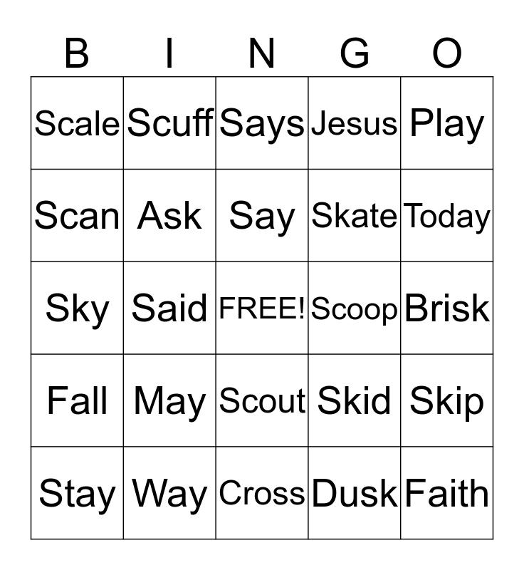 This bingo card has a free space and 24 words: May, Way, Say, Stay, Play, Scale, Scan, Scuff, Scoop, Scout, Skate, Sky, Skid, Skip, Ask, Dusk, Brisk, Says, Today, Said, Faith, Fall, Jesus and Cross.
