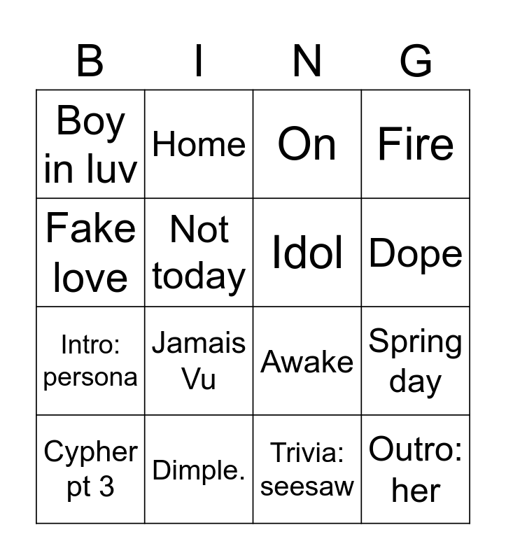 This bingo card has 16 words: Dimple., Spring day, On, Boy in luv, Intro: persona, Home, Awake, Trivia: seesaw, Fake love, Not today, Cypher pt 3, Fire, Jamais Vu, Dope, Idol and Outro: her.