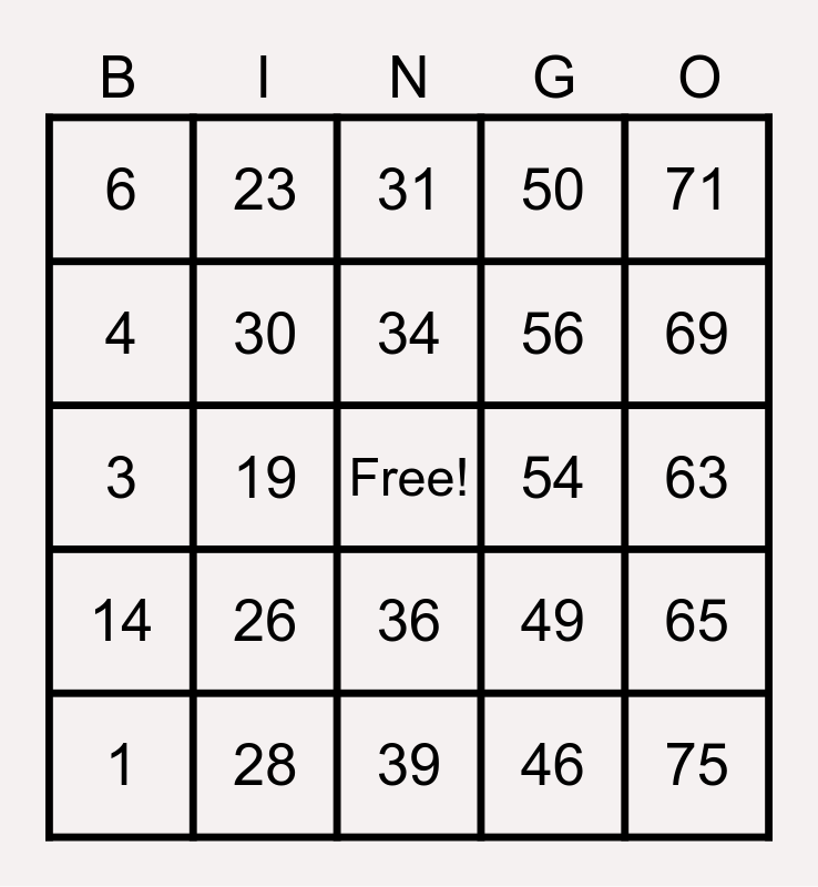 This bingo card has a free space and 24 words: 1, 26, 34, 46, 71, 6, 23, 31, 54, 63, 3, 30, 49, 65, 4, 28, 39, 50, 69, 14, 19, 36, 56 and 75.
