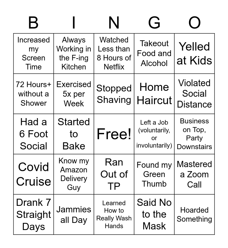 This bingo card has a free space and 29 words: Drank 7 Straight Days, Gained 19 Pounds, Started to Bake, Juggling 2+ Jobs, Increased my Screen Time, Watched Less than 8 Hours of Netflix, Exercised 5x per Week, Know my Amazon Delivery Guy, Left a Job (voluntarily, or involuntarily), Jammies all Day, Business on Top, Party Downstairs, Hoarded Something, Learned How to Really Wash Hands, Said No to the Mask, Violated Social Distance, Sneezed or Coughed In Public, Ran Out of TP, Covid Cruise, Yelled at Kids, Had a 6 Foot Social, Found my Green Thumb, Did Something Artistic, Home Haircut, 72 Hours+ without a Shower, Takeout Food and Alcohol, Always Working in the F-ing Kitchen, Mastered a Zoom Call, Stopped Shaving and Made Summer Plans.
